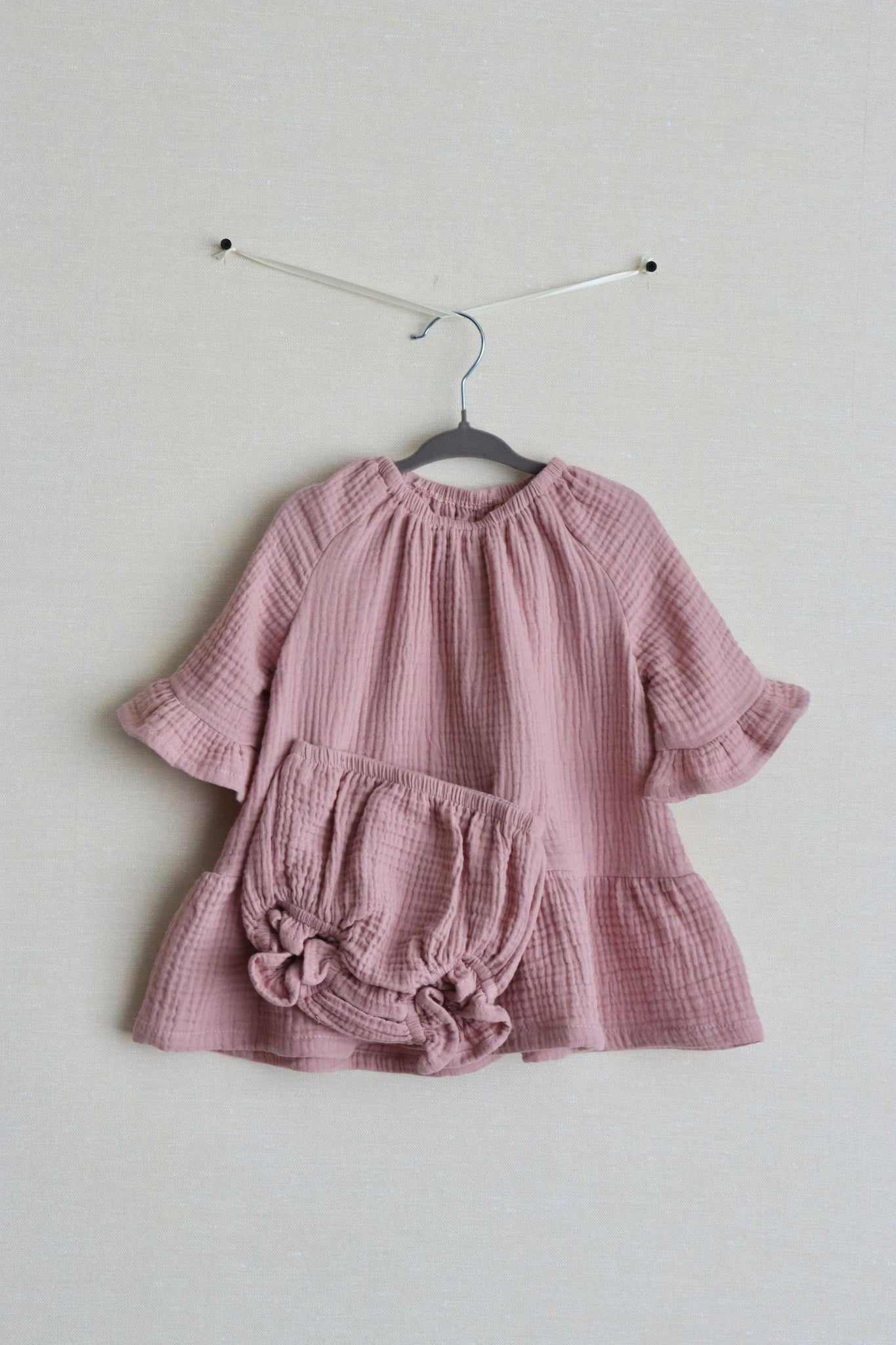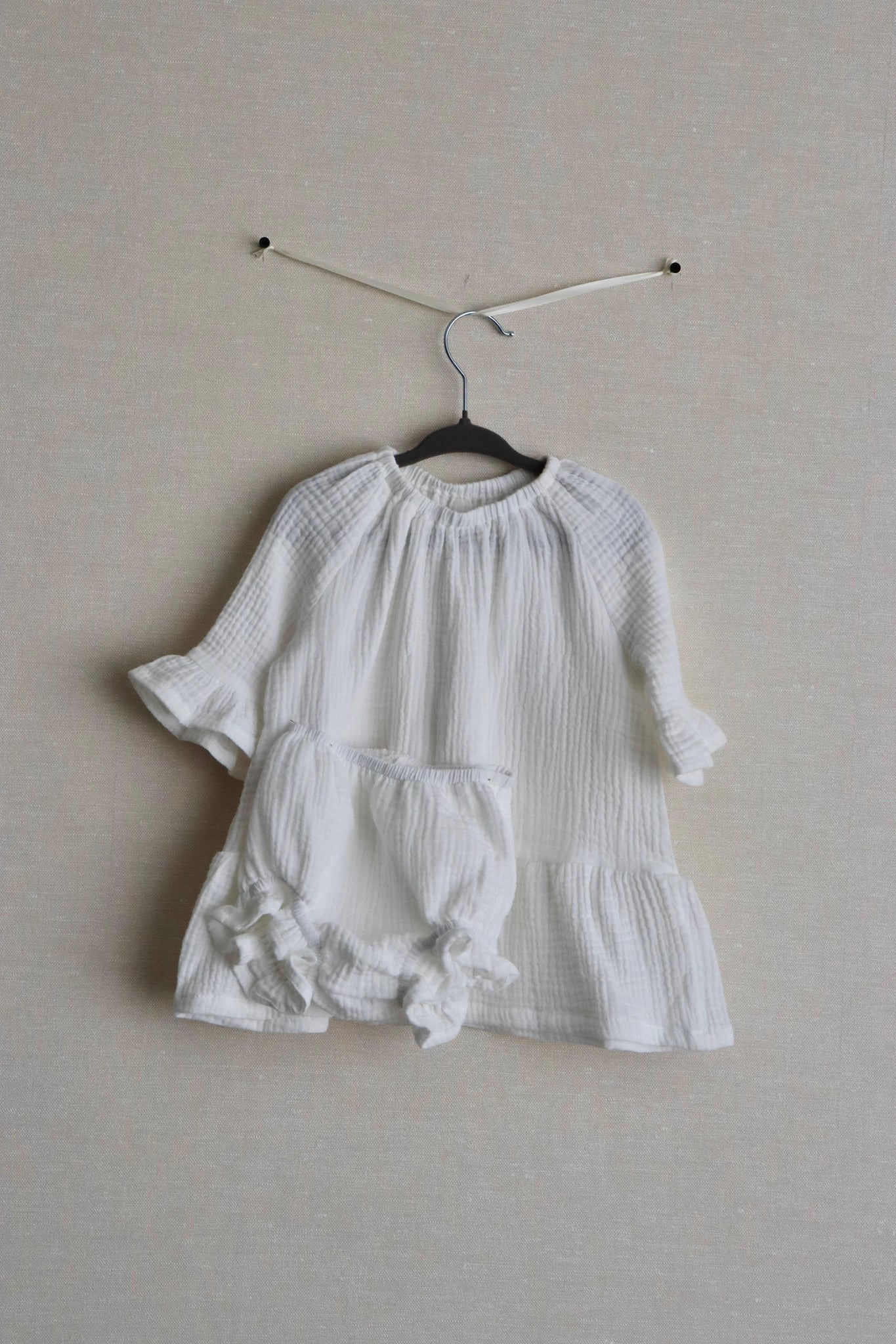 Delicado, fresco y lleno de encanto. El look Sofía esta confeccionado en muselina 100% algodón, una tela ultrasuave, ligera y transpirable, ideal para acompañar la piel sensible de tu nena durante todo el año.